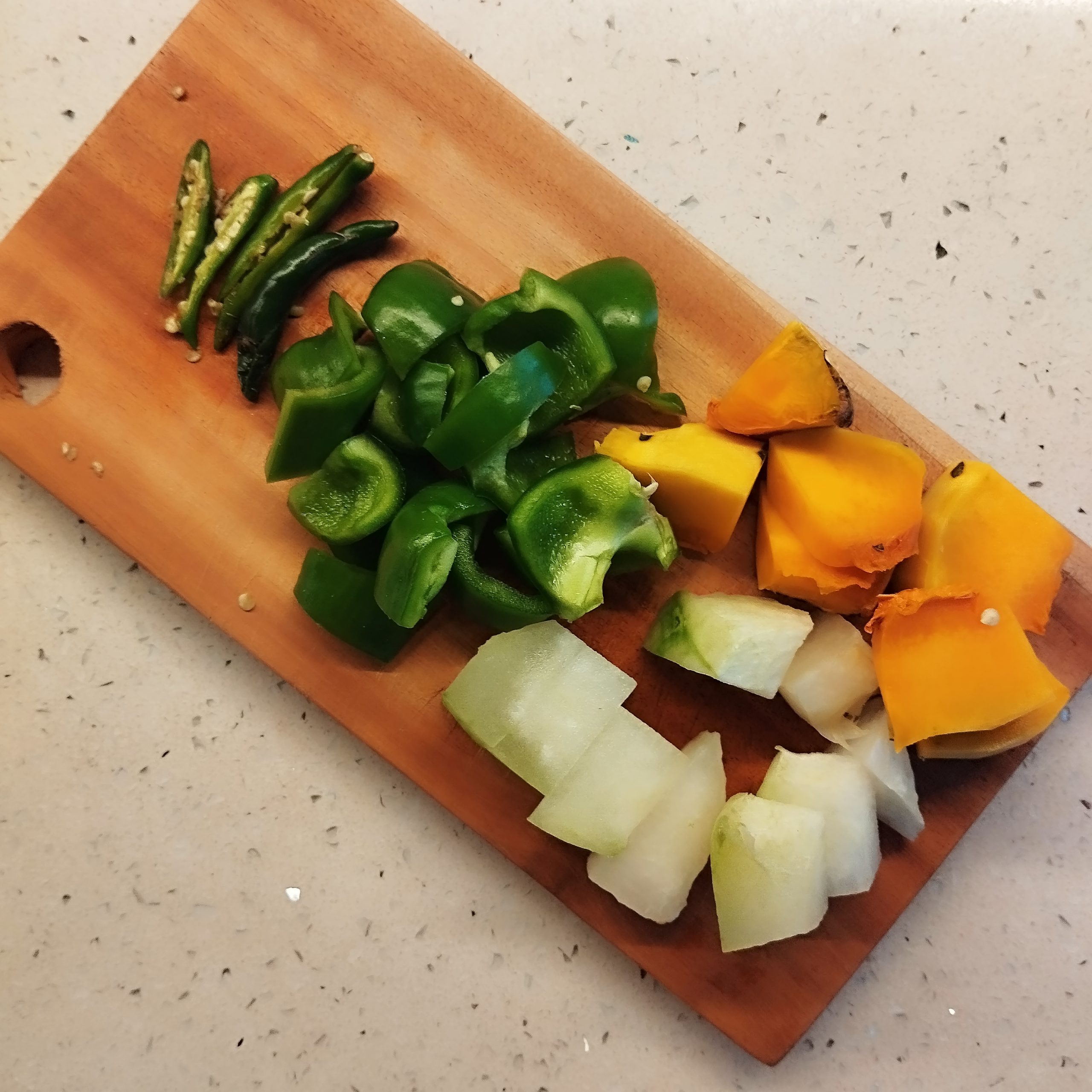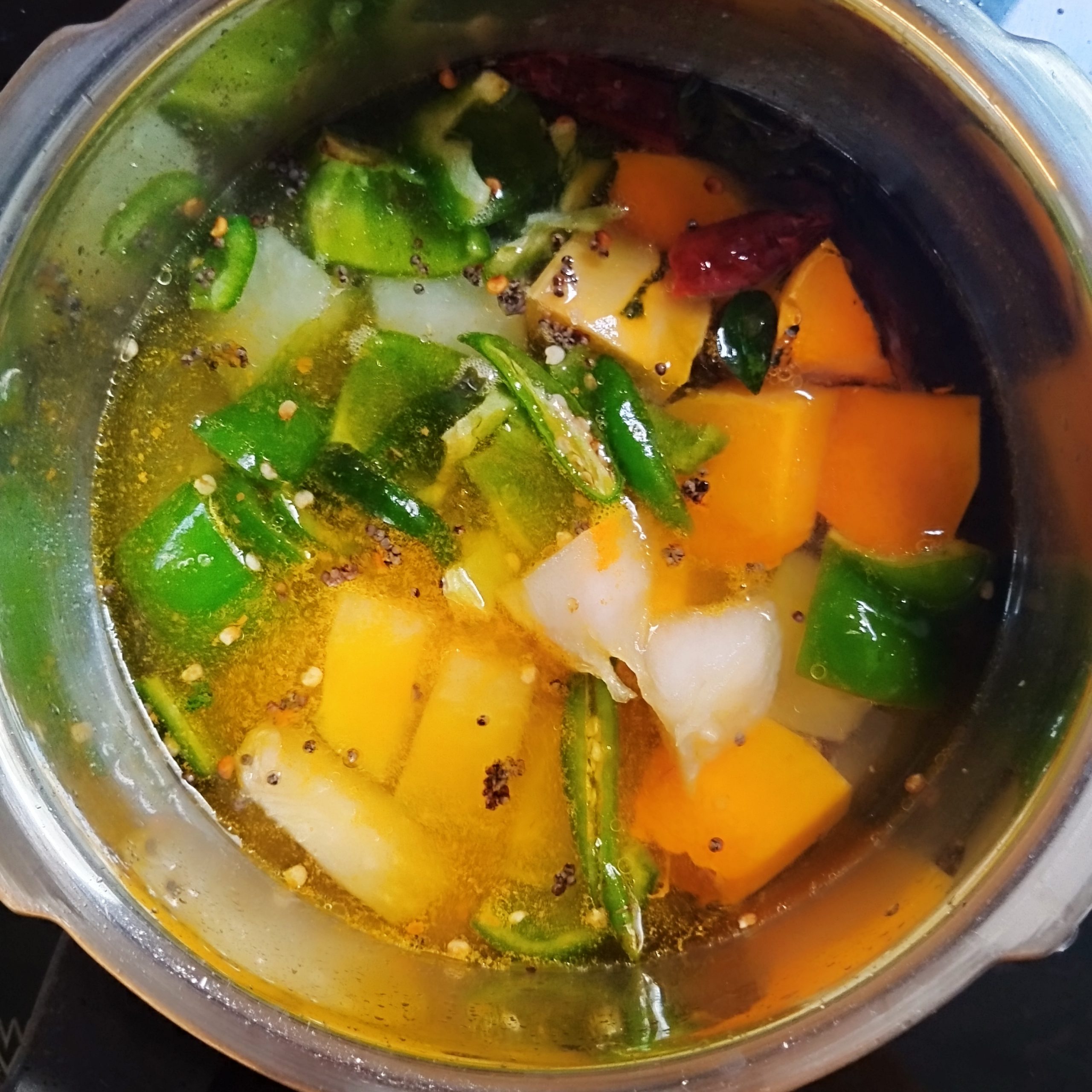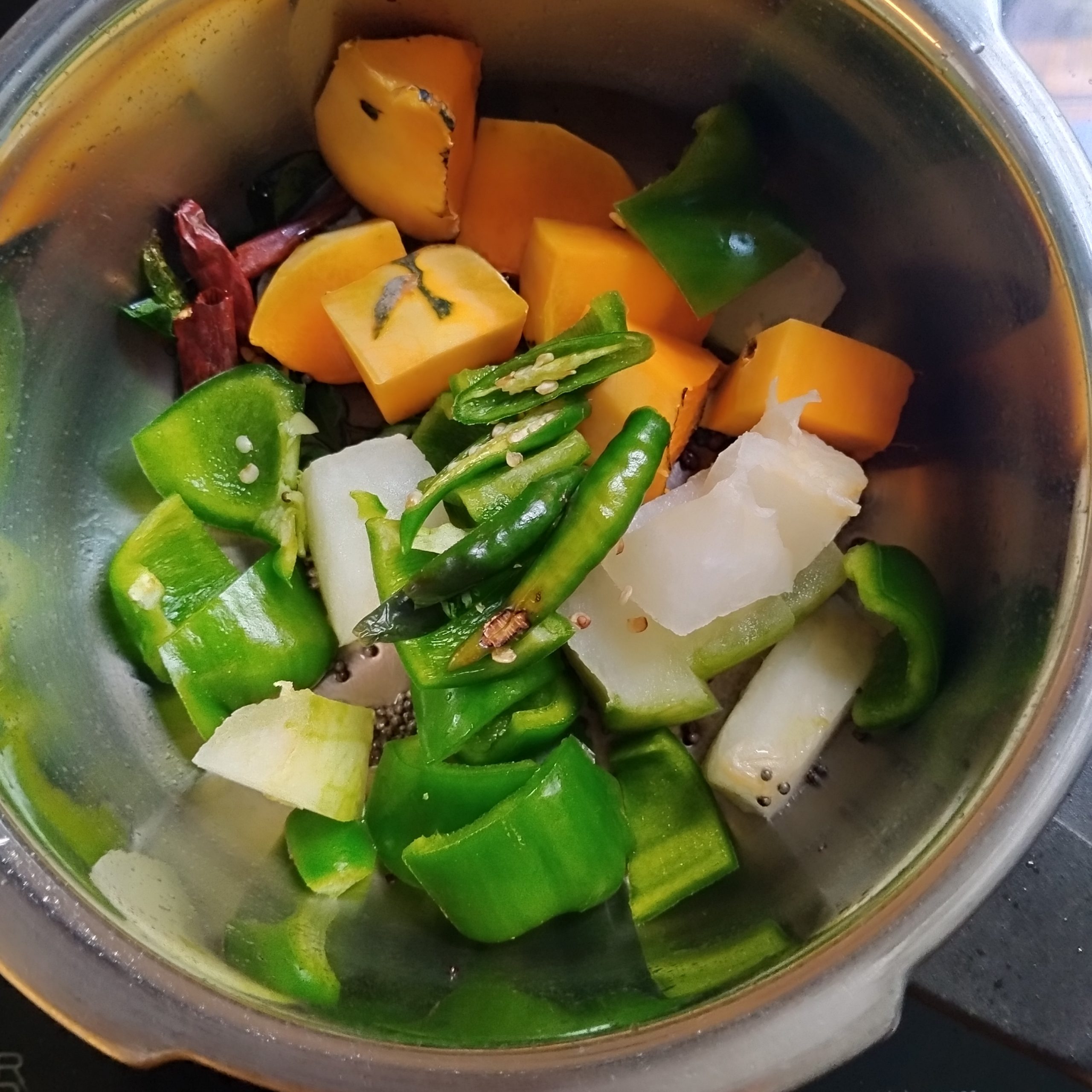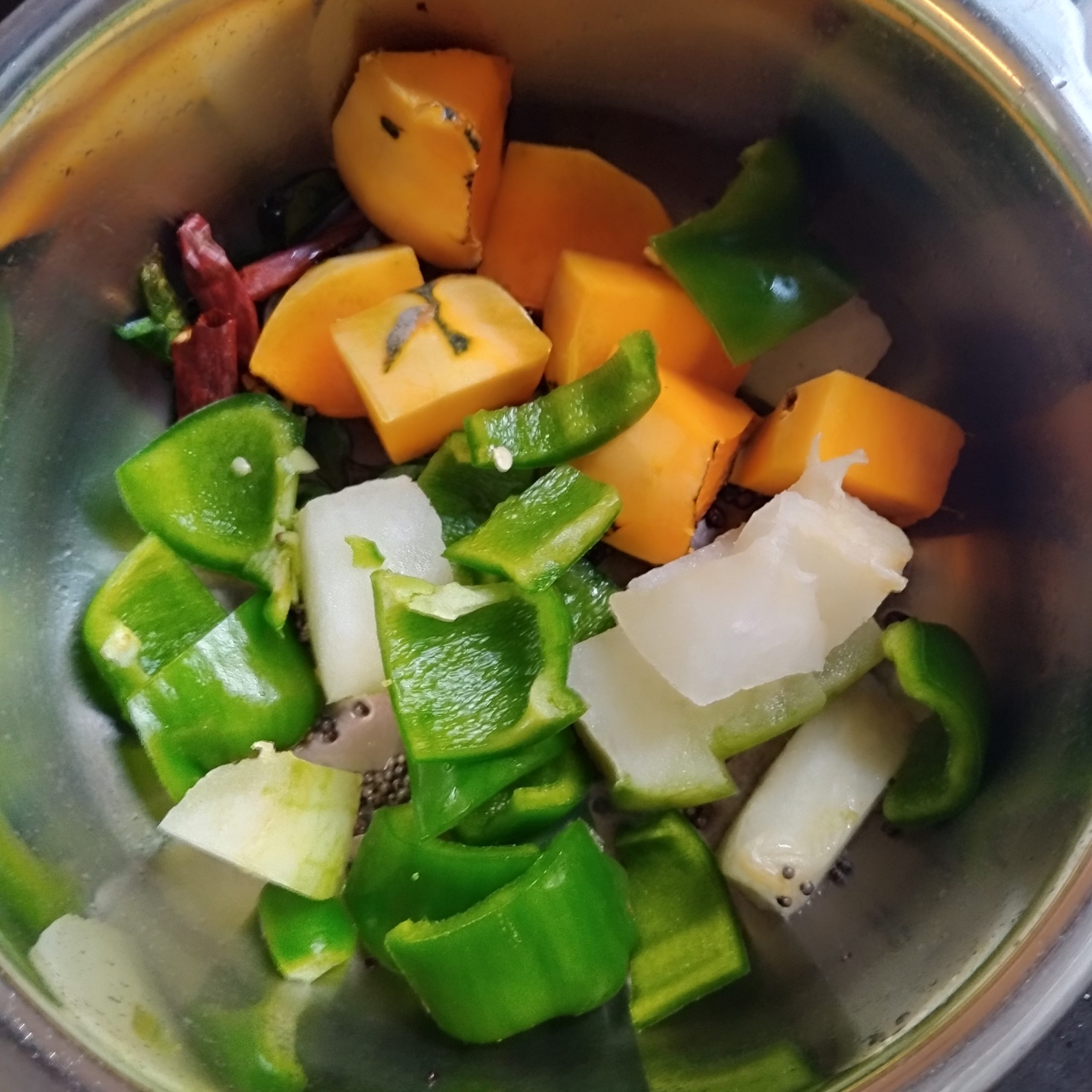 - Chop the vegetables into large chunks. I have used white pumpkin, sweet pumpkin, and capsicum, but you can also add raw banana, drumstick, or yam.