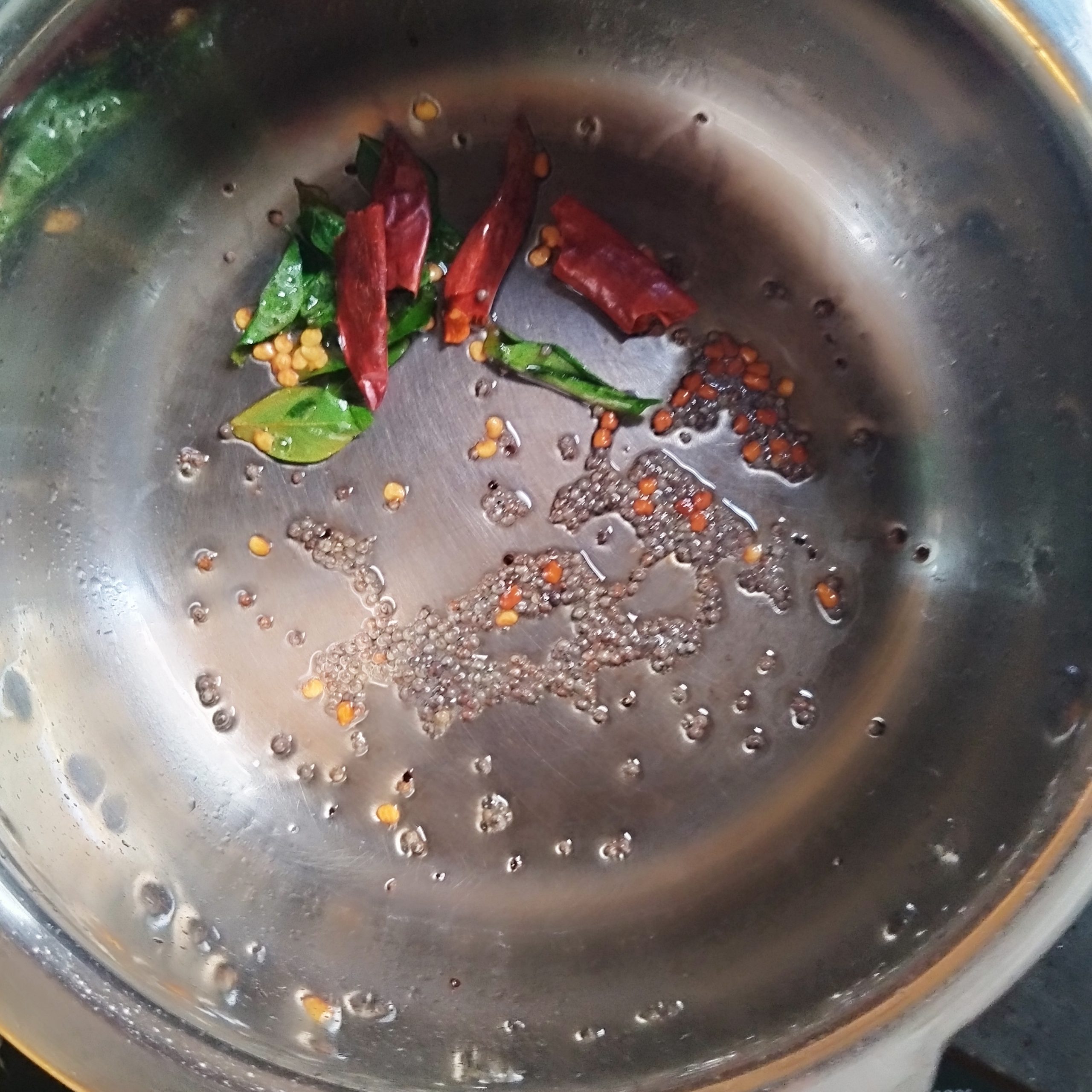 - In a kadai or pan, heat coconut oil and splutter mustard seeds. Add red chilies and curry leaves, then sauté for a minute.