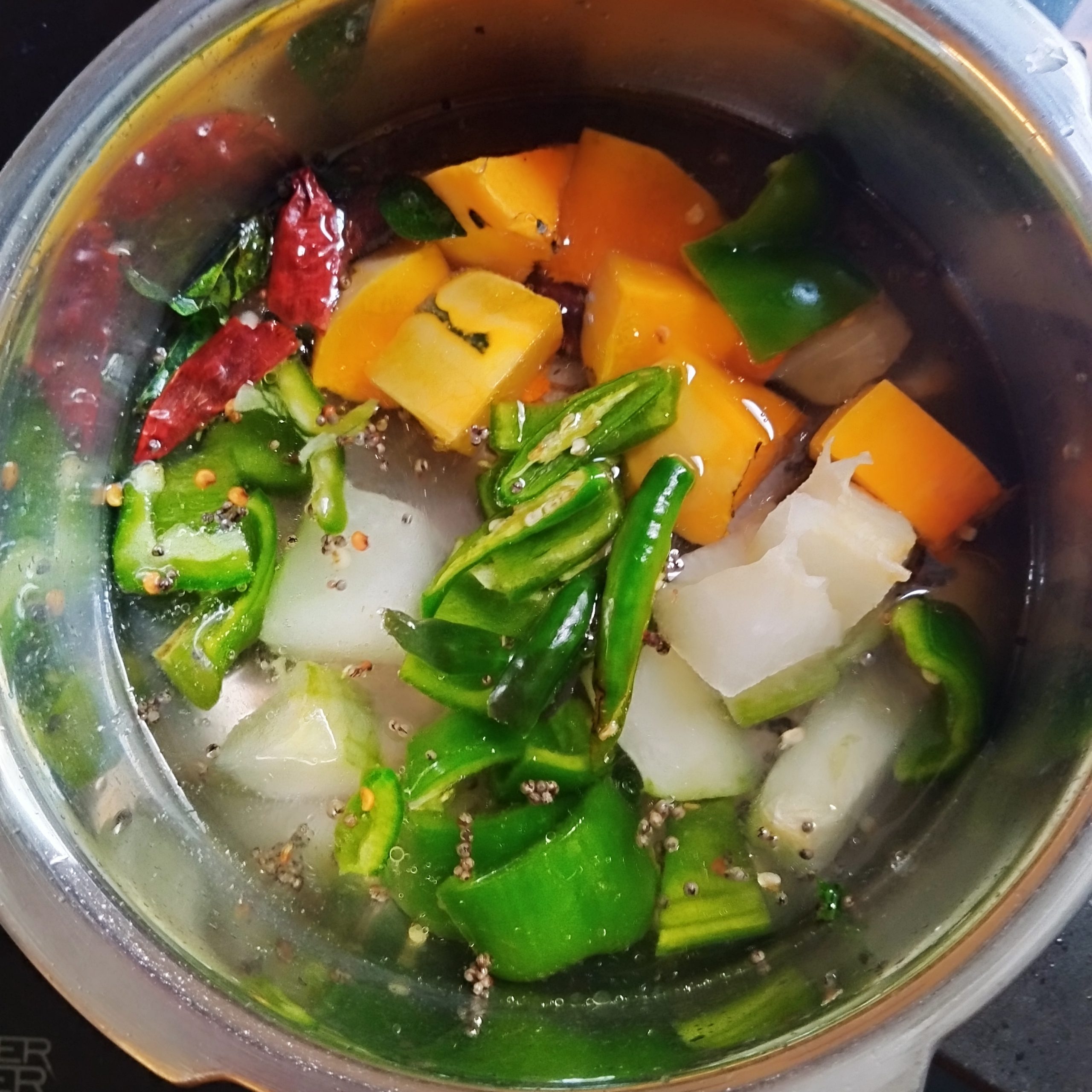 - In a kadai or pan, heat coconut oil and splutter mustard seeds. Add red chillies and curry leaves, then sauté for a minute. Next, add the chopped vegetables along with slit green chillies and mix well.
