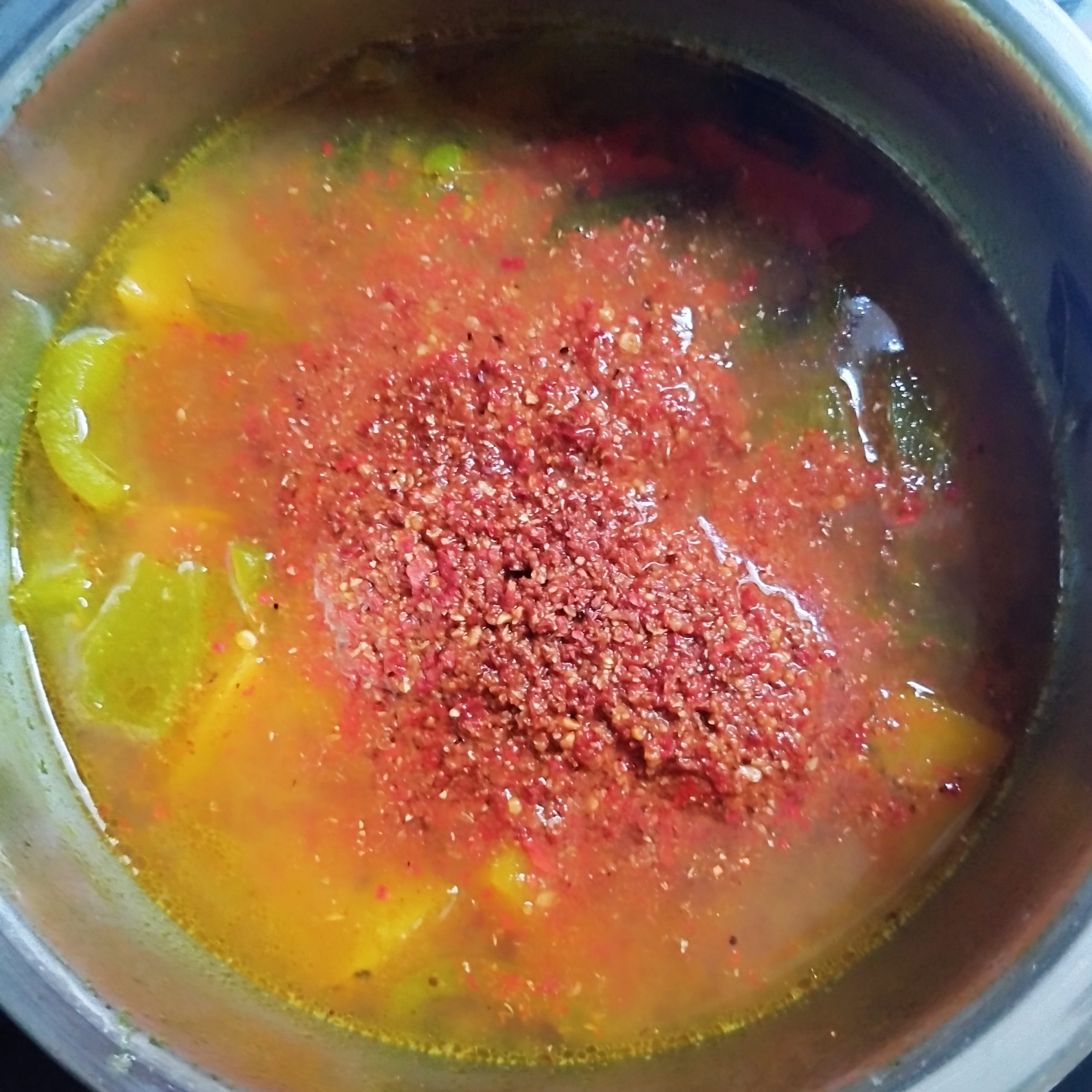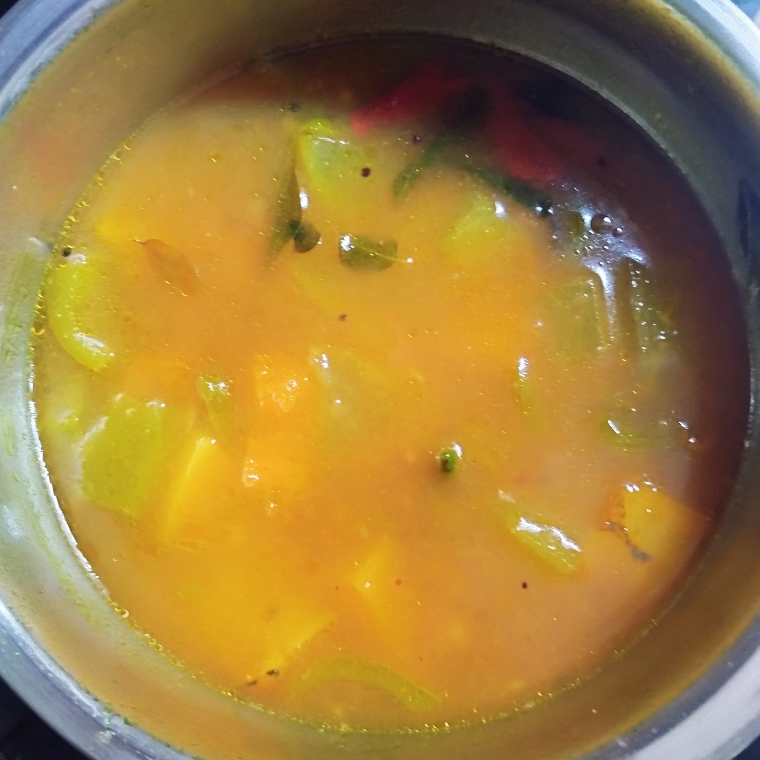 - Once the vegetables are nearly cooked, add the tamarind water and bring it to a boil.