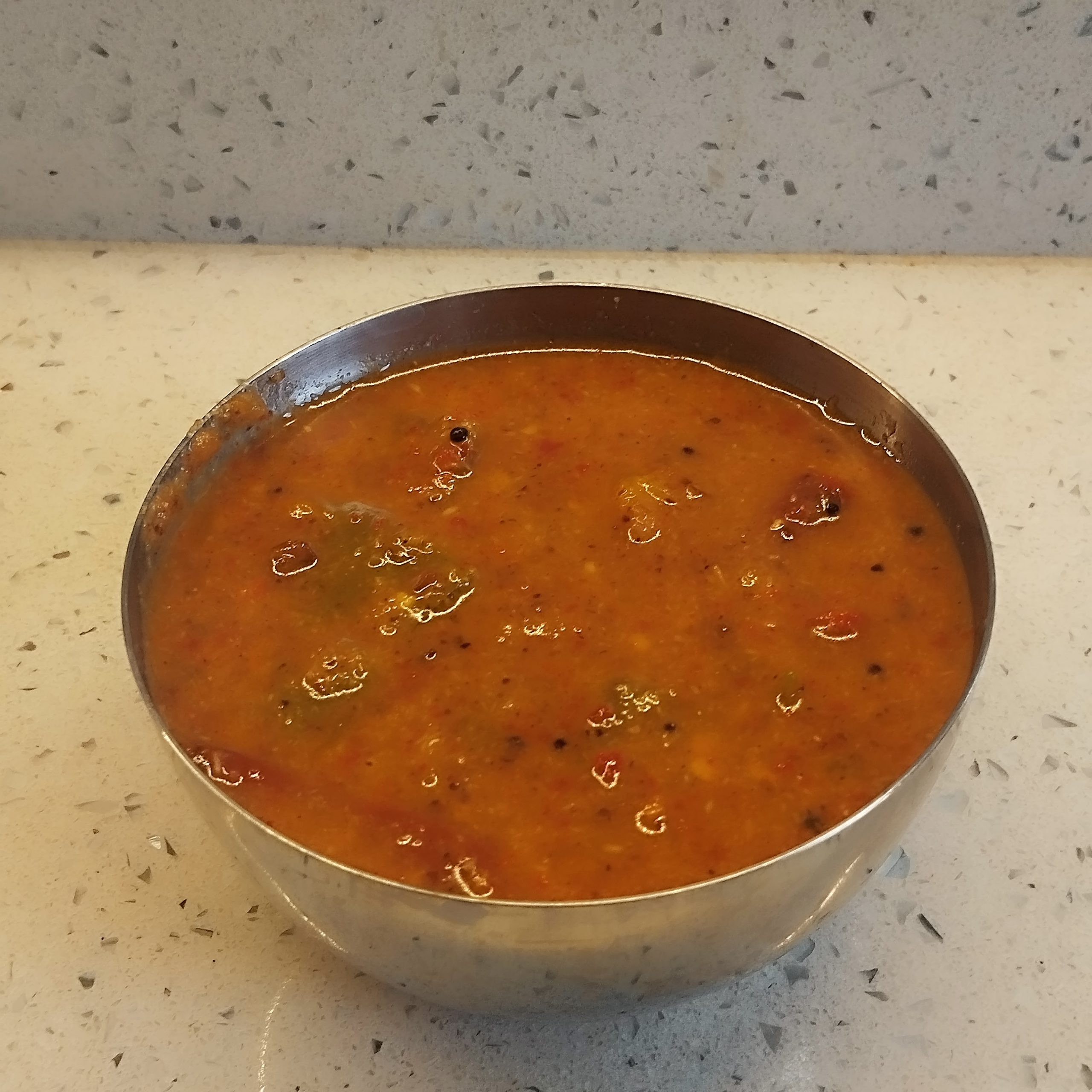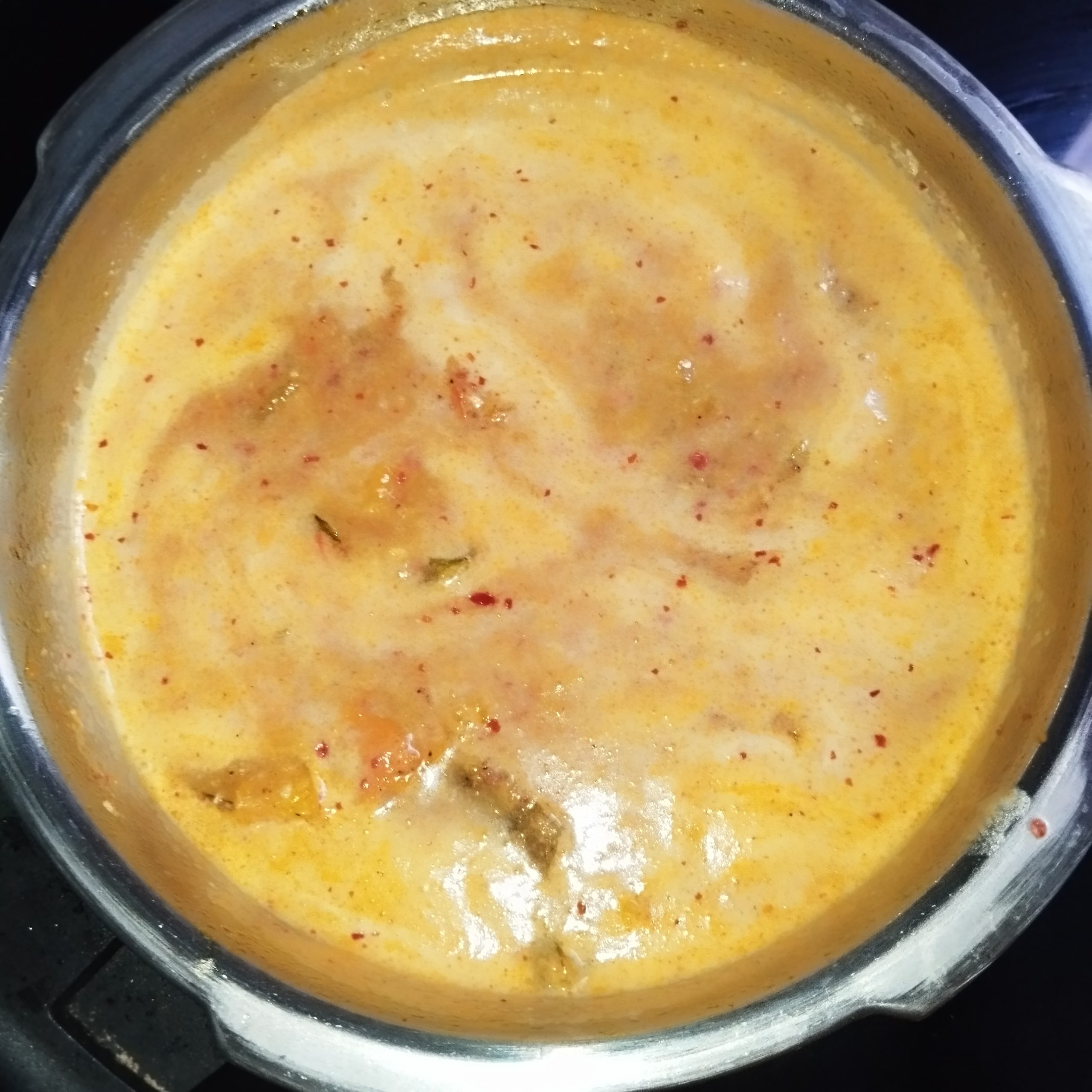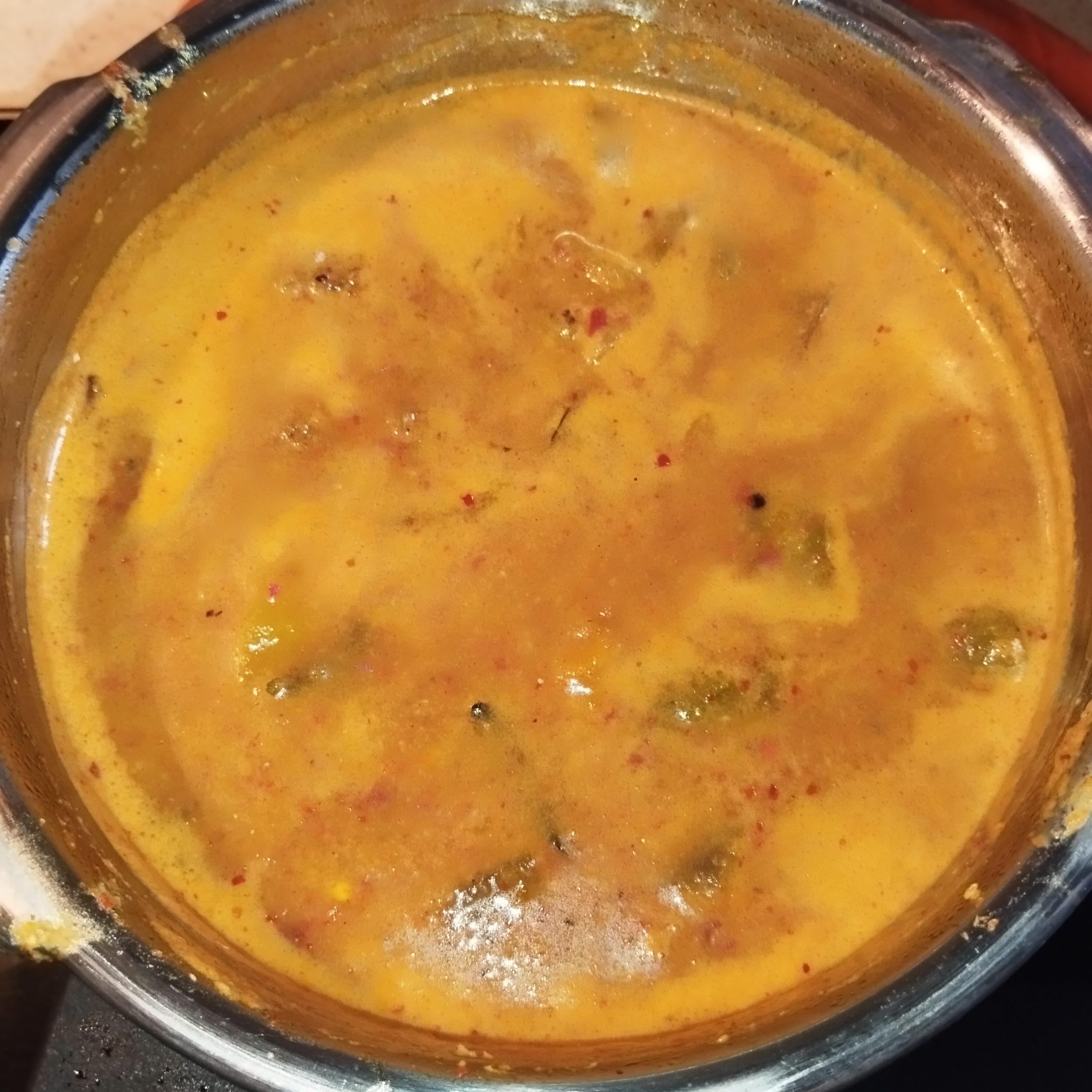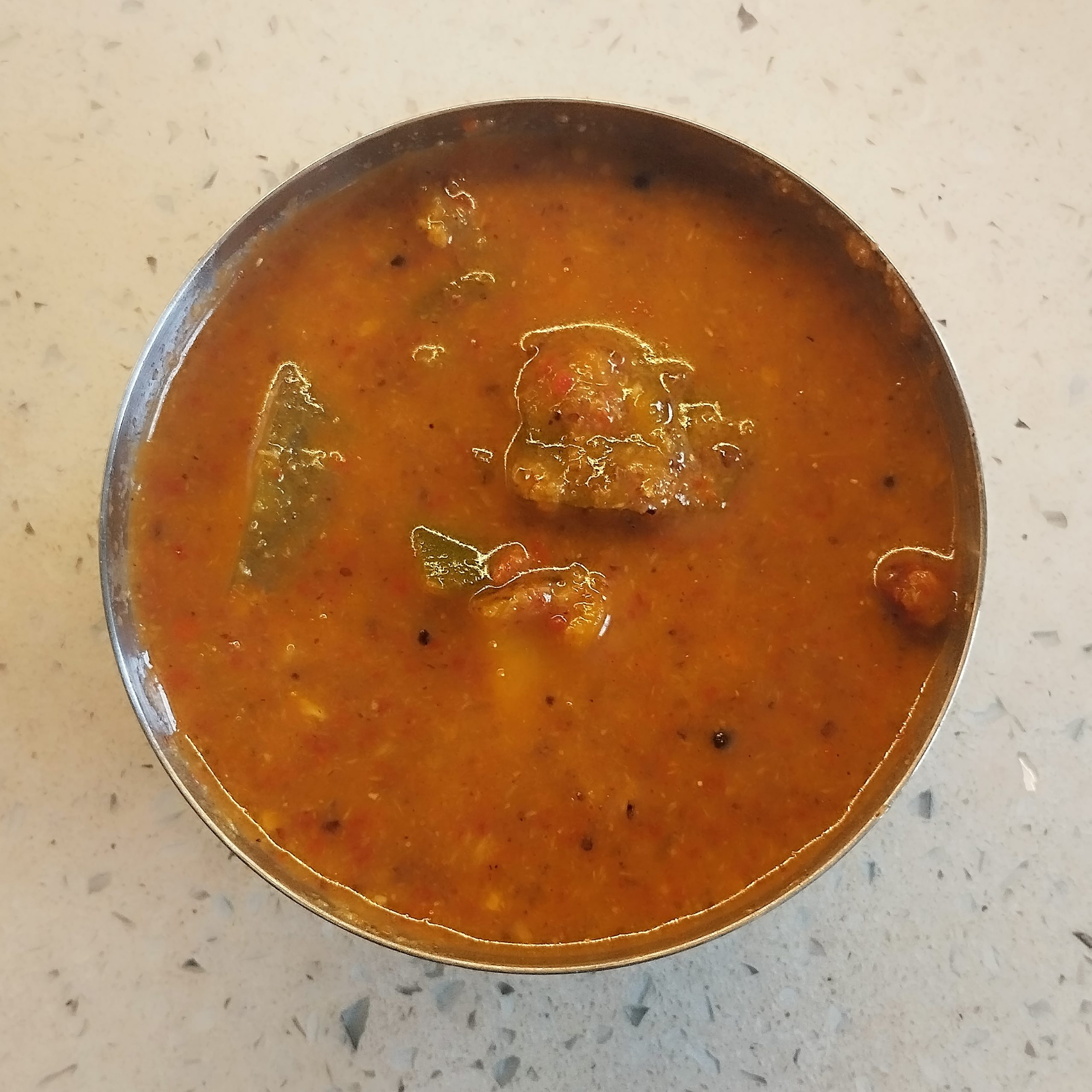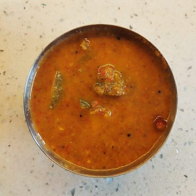Pulinkari vs. Sambar – Sambar includes cooked lentils (toor dal), while Pulinkari is lentil-free and has a more pronounced tamarind and coconut flavour.