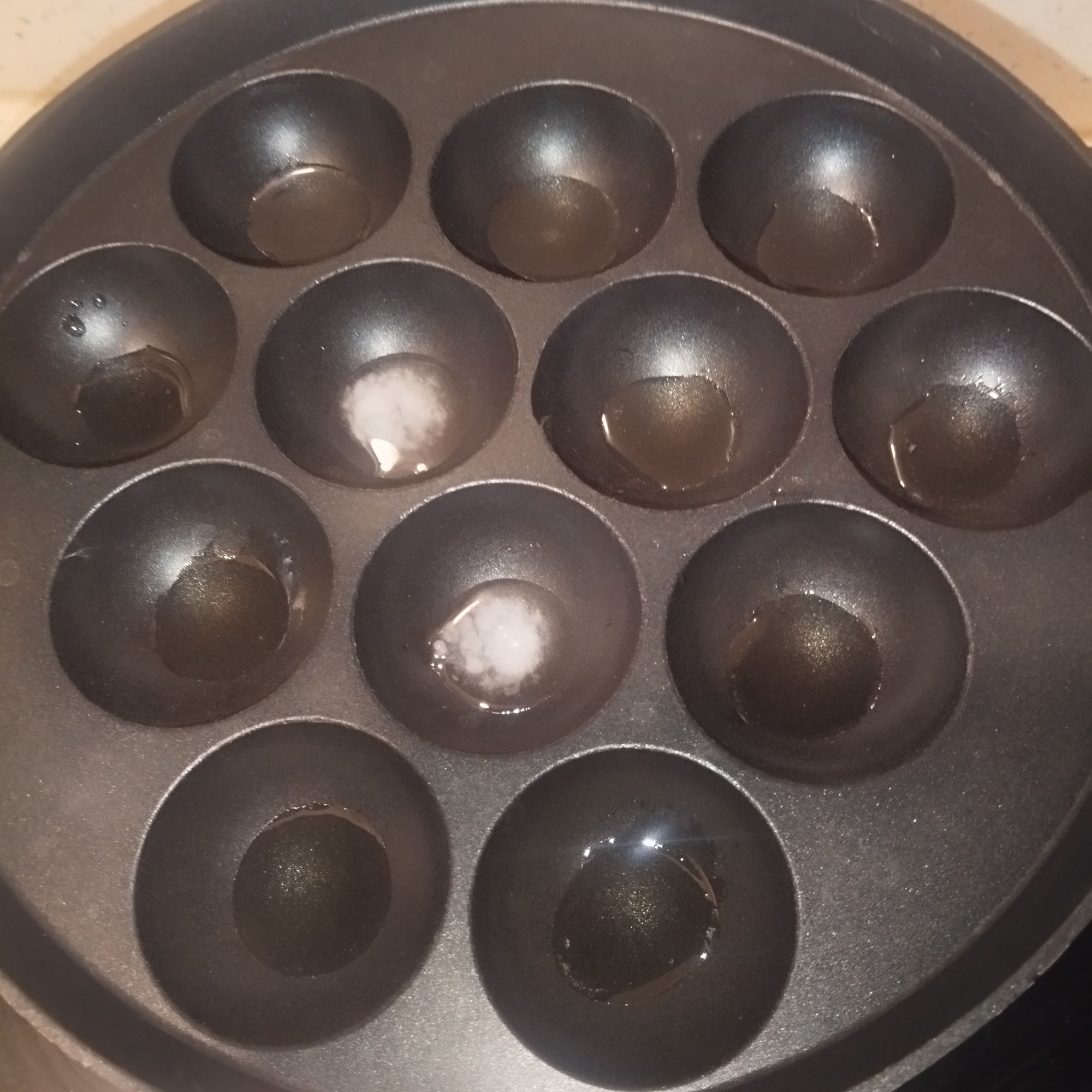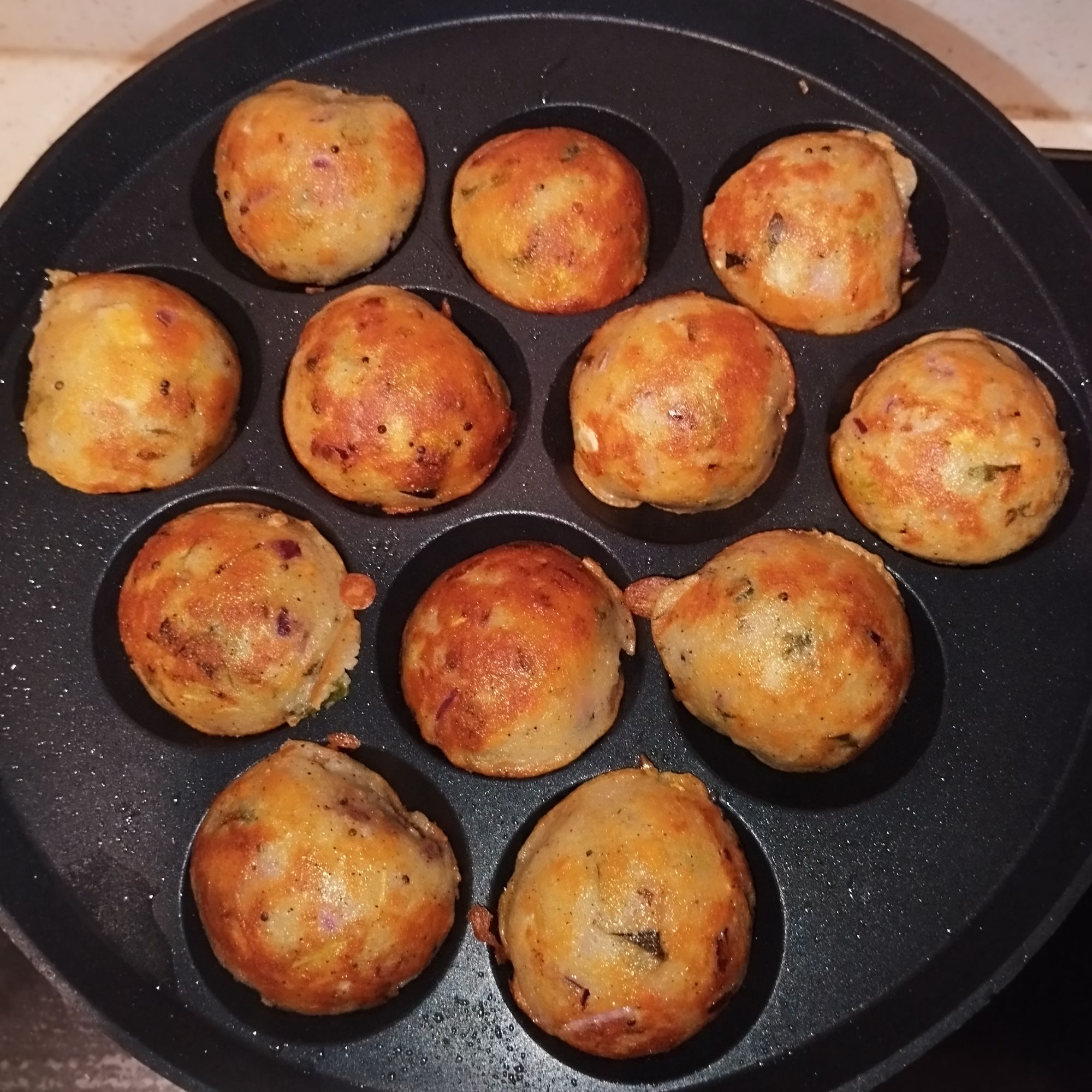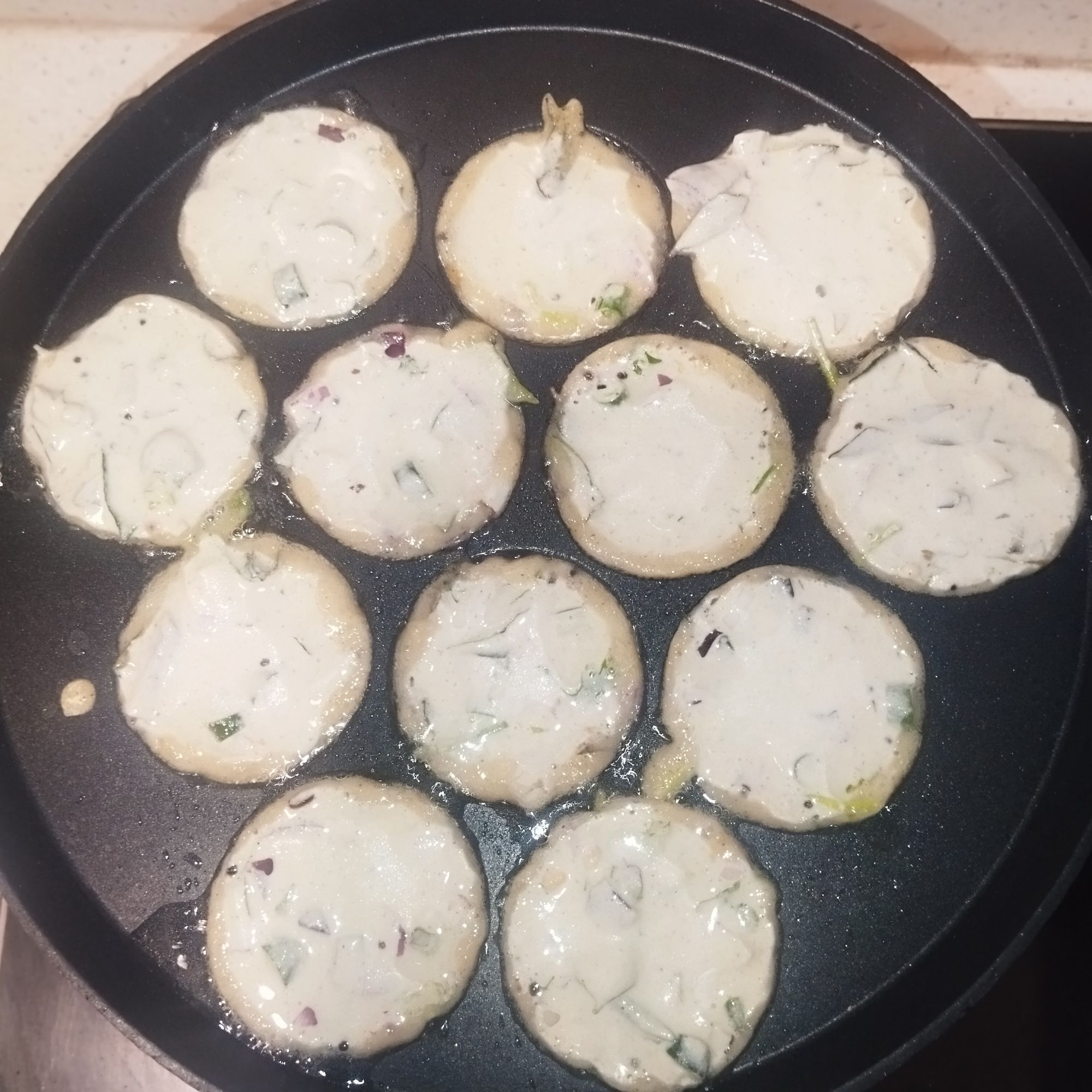 - Heat the paniyaram pan and add a teaspoon of oil in each cavity.